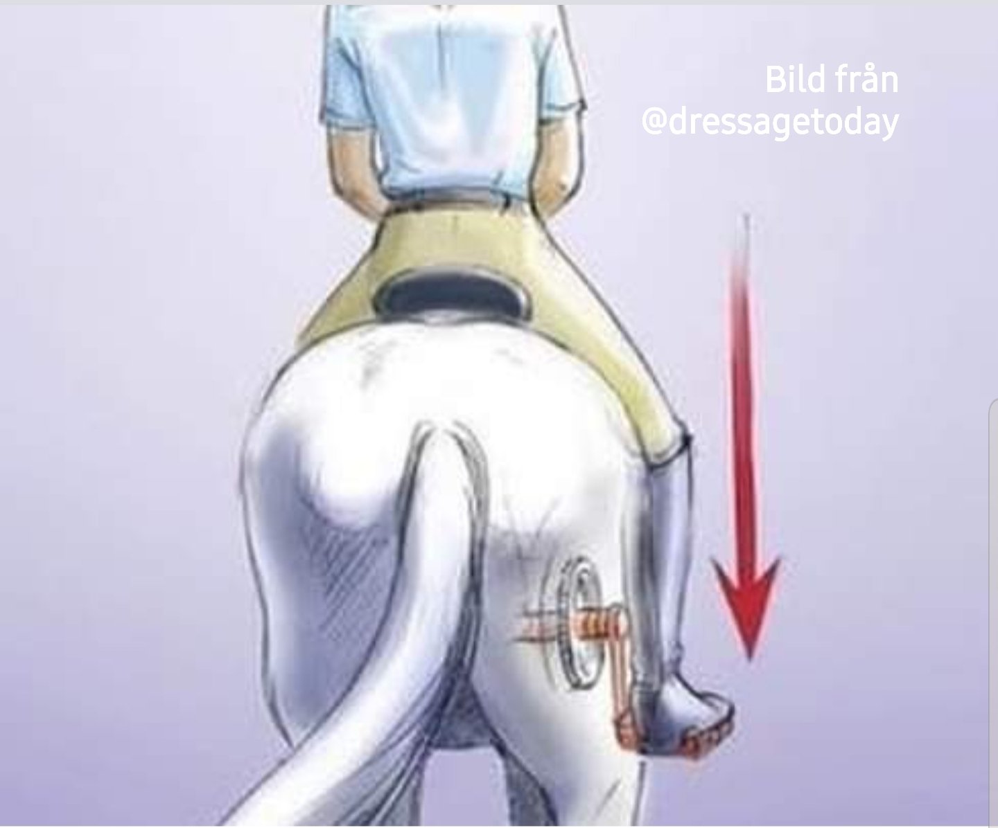 Tänk dig att du cyklar baklänges med dina ben. Då hamnar rörelse i lårbenen och om vi gör större cirkel så får vi längre steg från hästen.