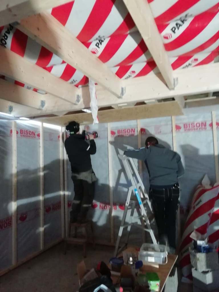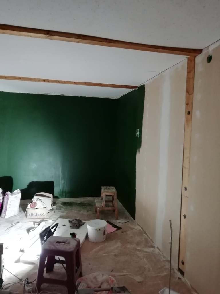Resten kändes enkel, regal upp taket och golvet för logen ovanpå. Regla väggar, dra el, isolera, sätta upp skivor, spackla och som belöning fick jag äntligen börja måla med färgen jag läntat efter i ett och etthalvt år.