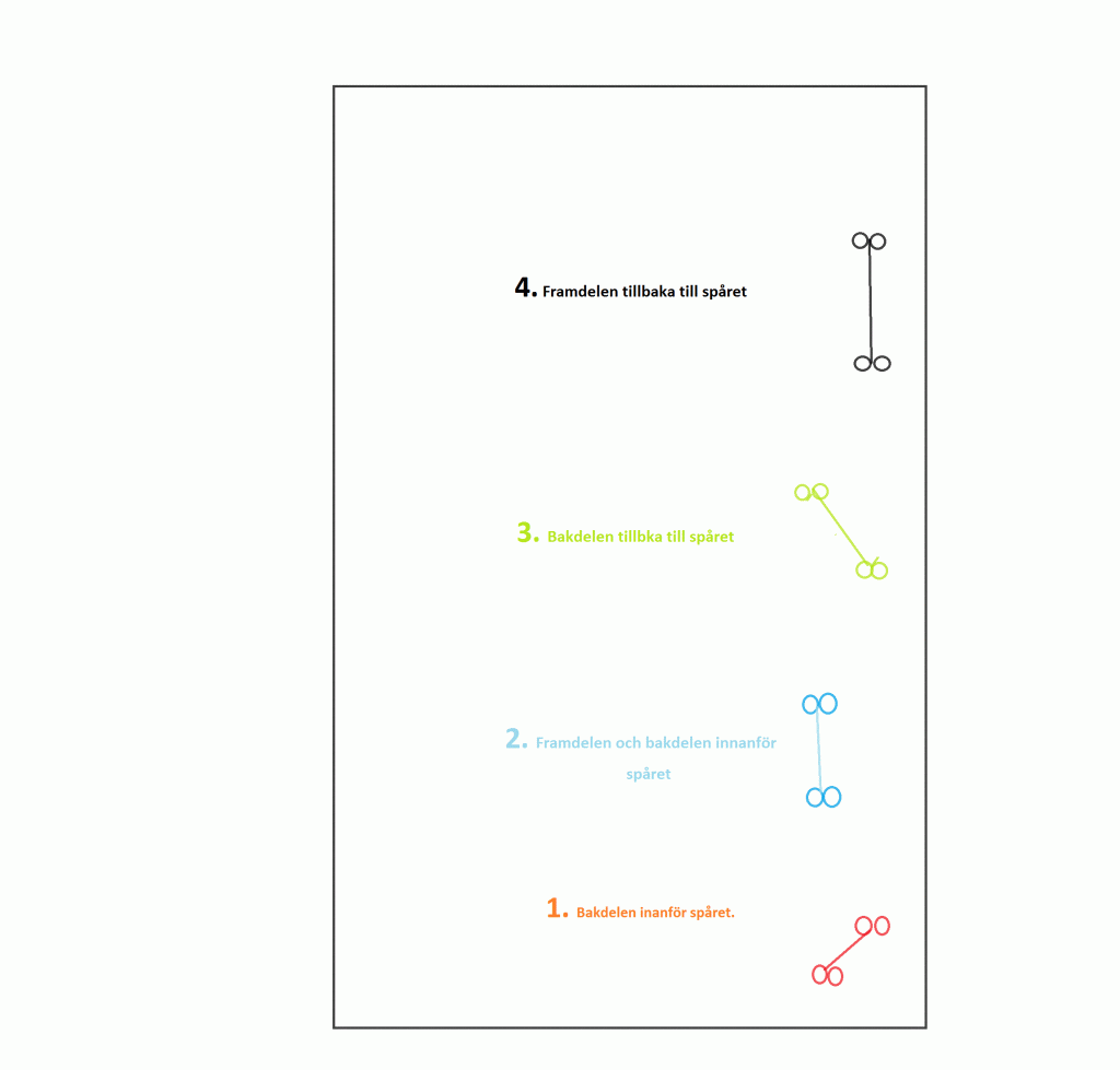 Den går ut på att du rider längs med spåret i vänster varv eller längs en väg. Flytta först hästens bakdel undan höger skänkel, så den kommer innanför spåret och så att hästen gör en skänkelvikning längs spåret några steg (1). Flytta sedan in hästens framdel, undan för höger skänkel så att den kommer framför bakdelen och hästen går rakriktad innanför spåret (2). Flytta sedan tillbaka hästens bakdel till spåret, undan vänster skänkel så den går några steg skänkelvikning med bakdelen på spåret och framdelen innanför spåret (3). Flytta sedan framdelen till spåret, undan vänster skänkel, så hästen går rakriktad på spåret igen. (4)