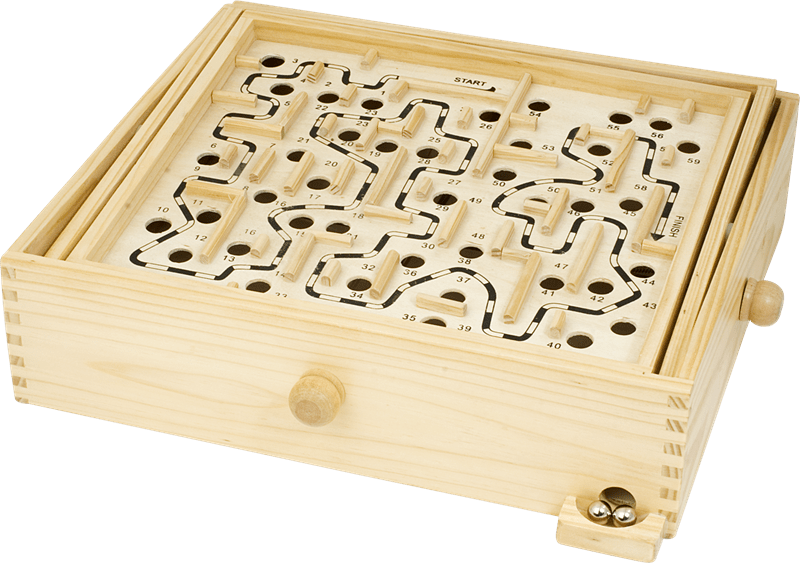 Kommer ni ihåg det här spelet? Man lägger en lite kula vid start och ska sedan, med hjälp av rattarna på sidan, tippa spelplanen och rulla kulan igenom labyrinten.